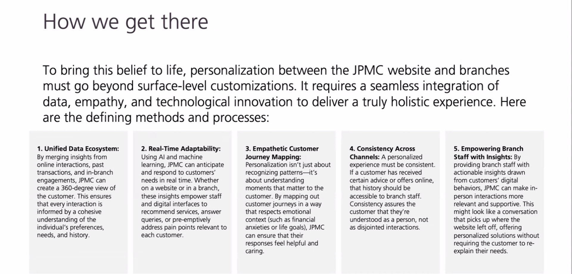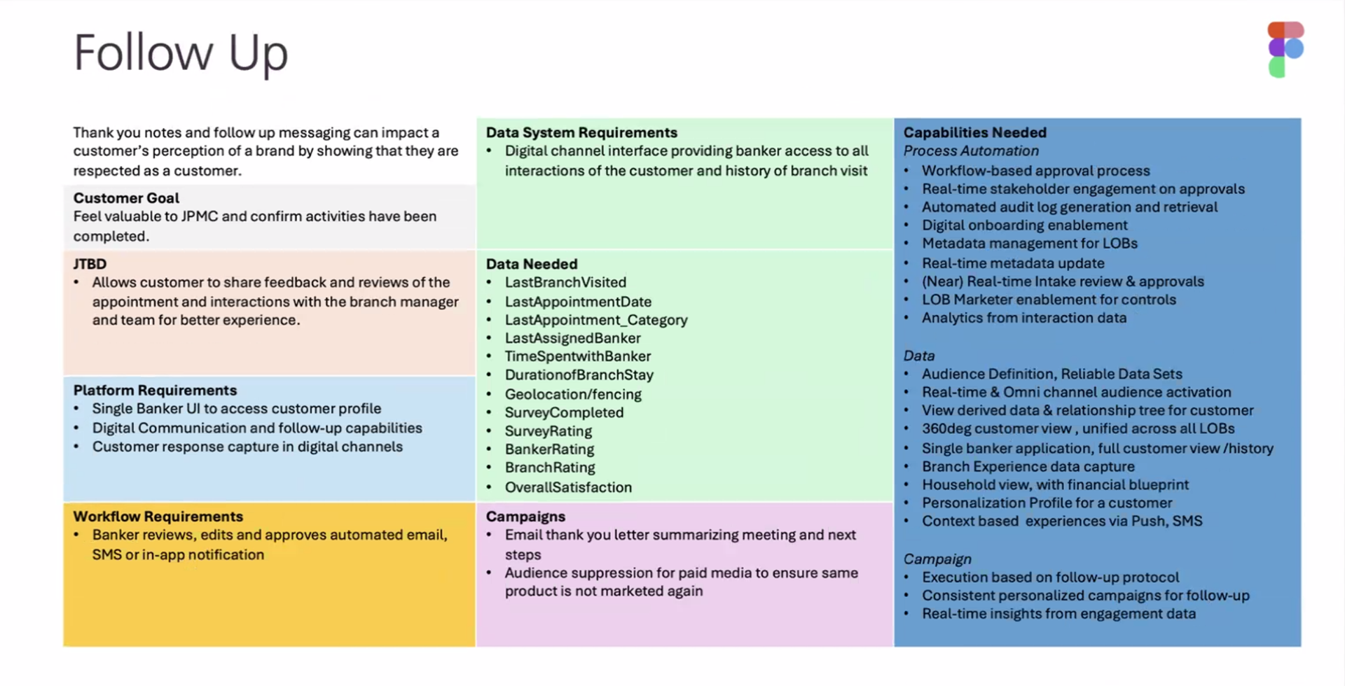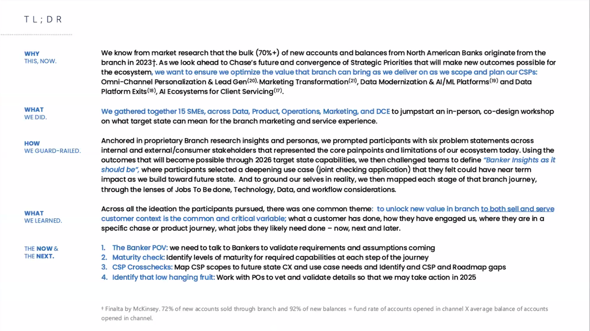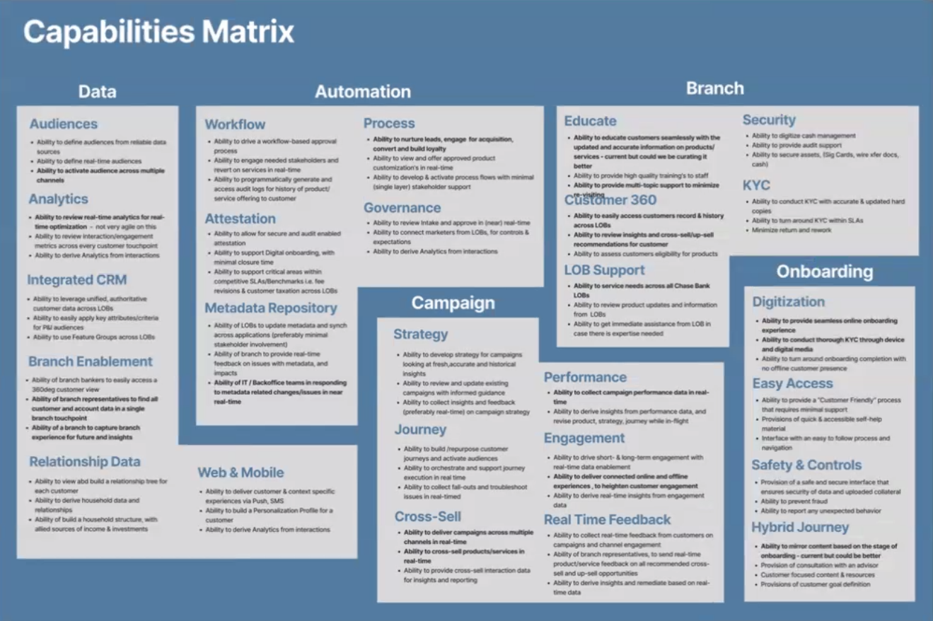 Together with 15 SMEs across Data, Product, Operations, Marketing , we defined what target state architecture can mean for the branch marketing and servicing experience at JP Morgan Chase.